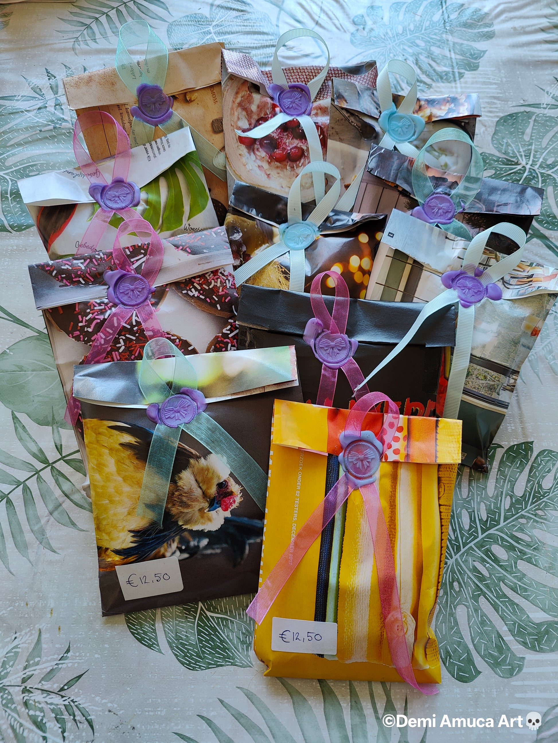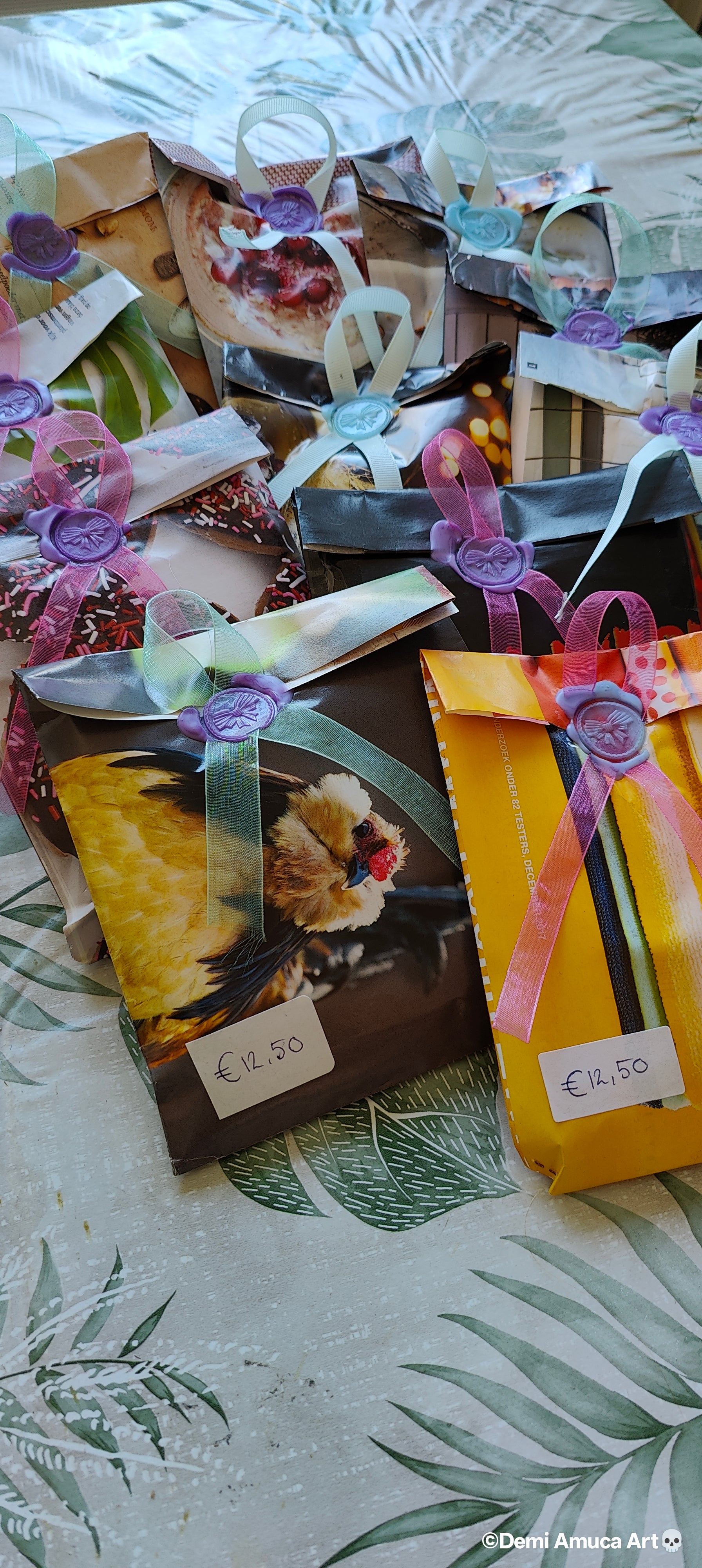 These tiny adorable wax sealed mystery bags contain a small original painted canvas, stickers and buttons!