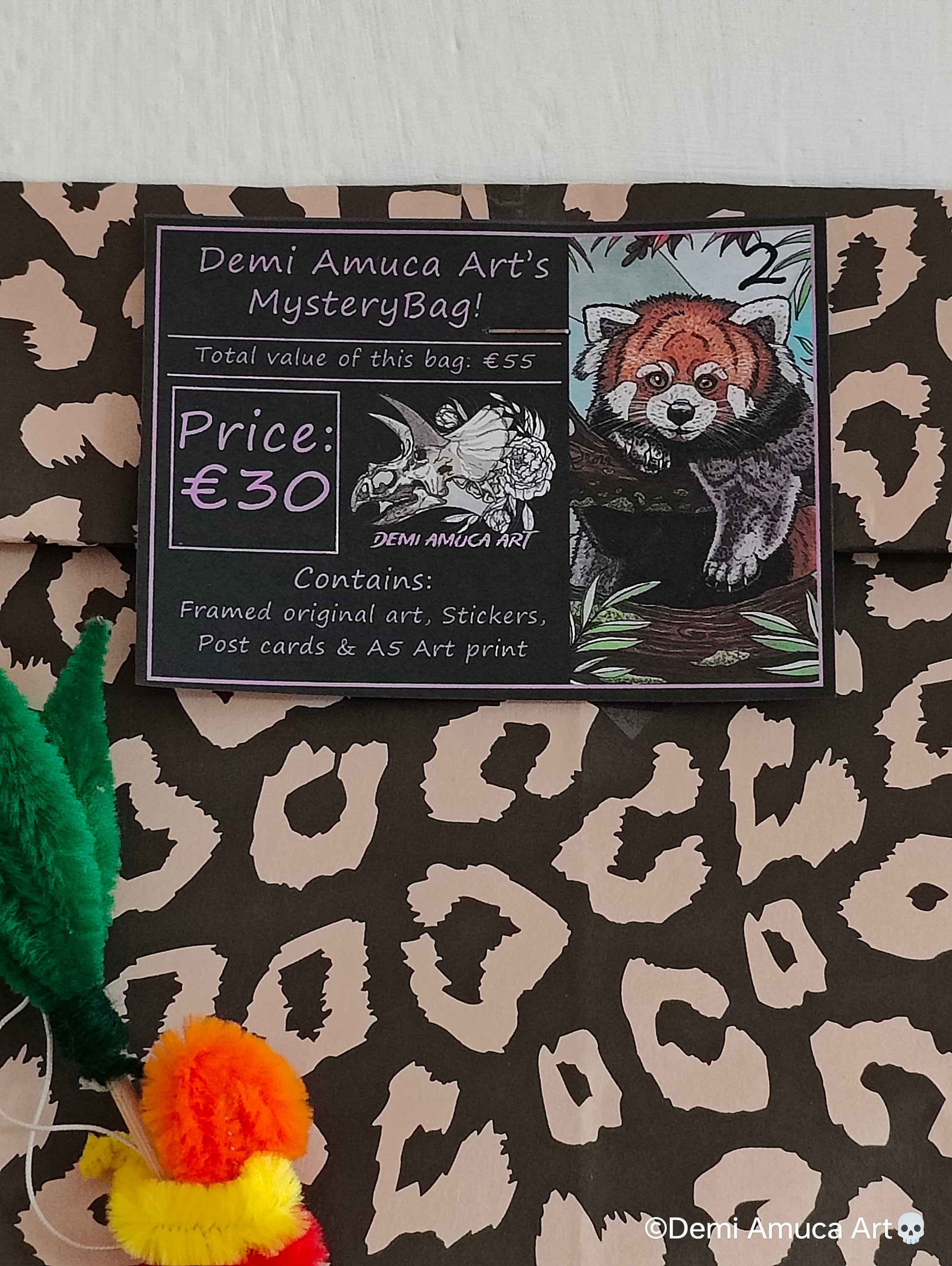 These cool mystery bags contain a framed original art or framed art print, stickers, post cards & A5 art prints! Their value is about €55